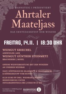 Wir rufen am Freitag, den 14. November im Bahnsteig 1 in Mayschoß zur Ahrtaler Maateljass – unserem traditionellen Erntedankfest, bei dem der neue Jahrgang gefeiert und auf ein arbeitsreiches, erfolgreiches Weinjahr angestoßen wird.